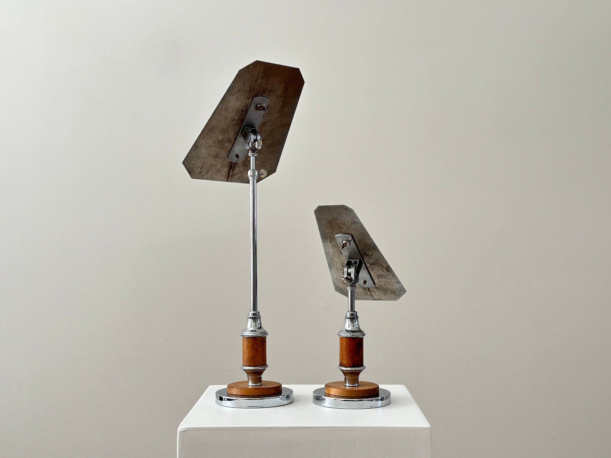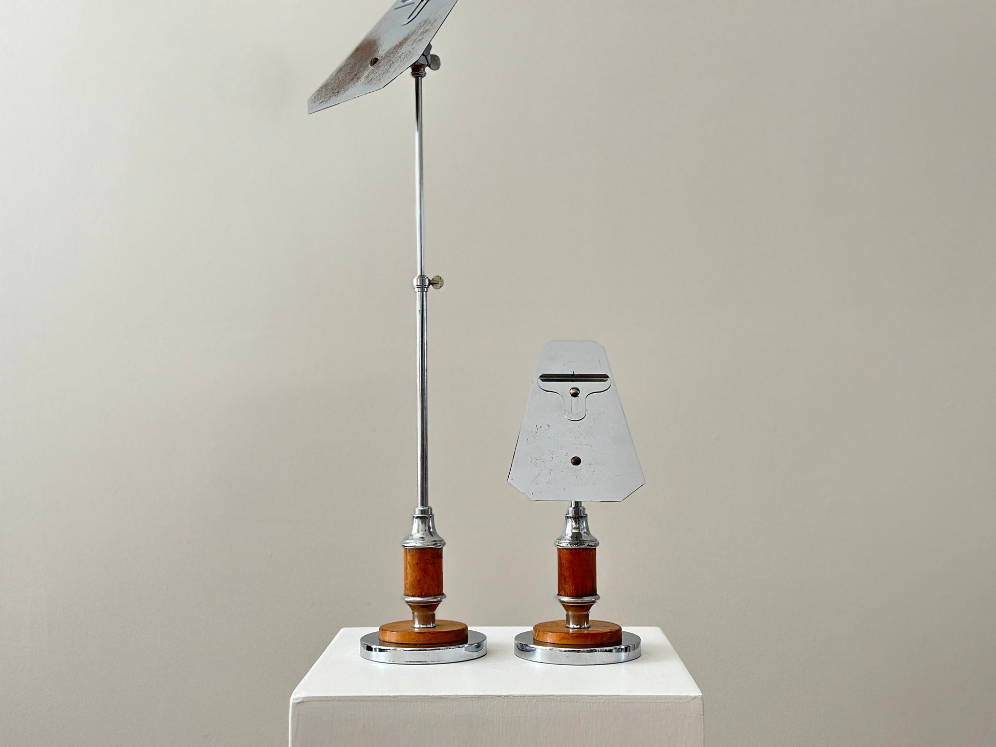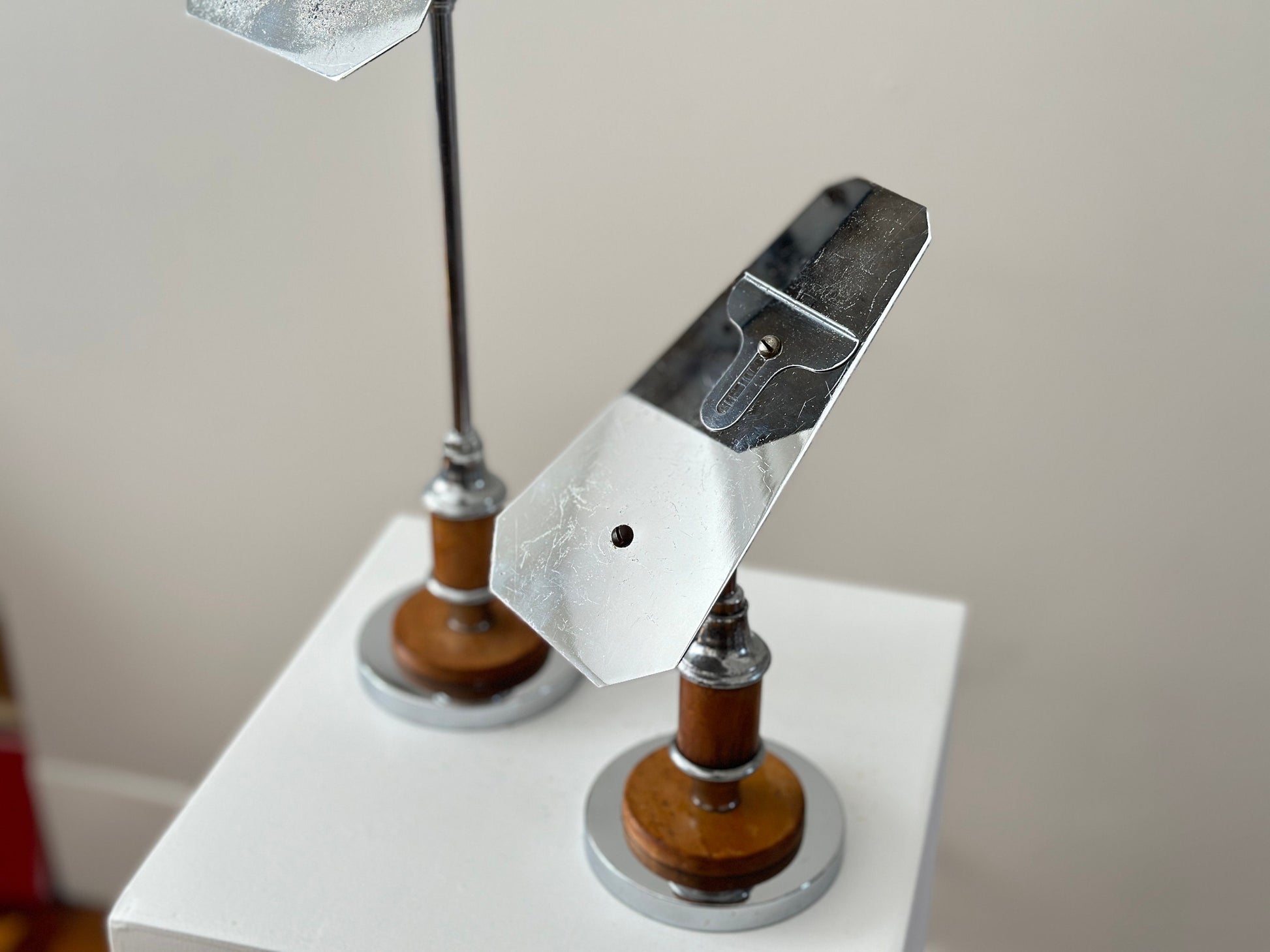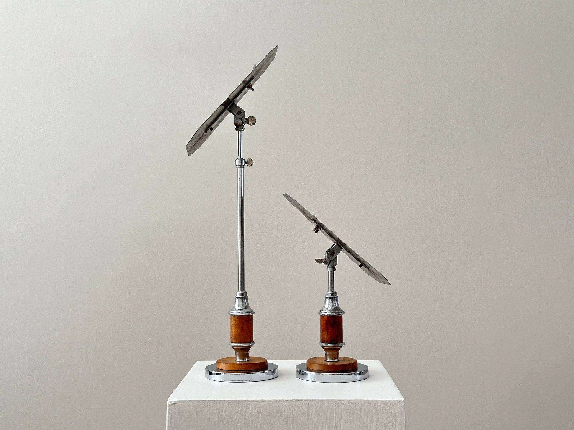 A beautifully designed pair of department store display stands from the 1930s. Great contrast between the burl wood and the chrome. The platform/plate is originally for shoes but I have repurposed these in the past by removing the plate and replacing it with signage or my own. The mount pivots fully vertical to fully horizontal. A great collector piece but also an item for a photographer to consider using to display items they are photographing.
