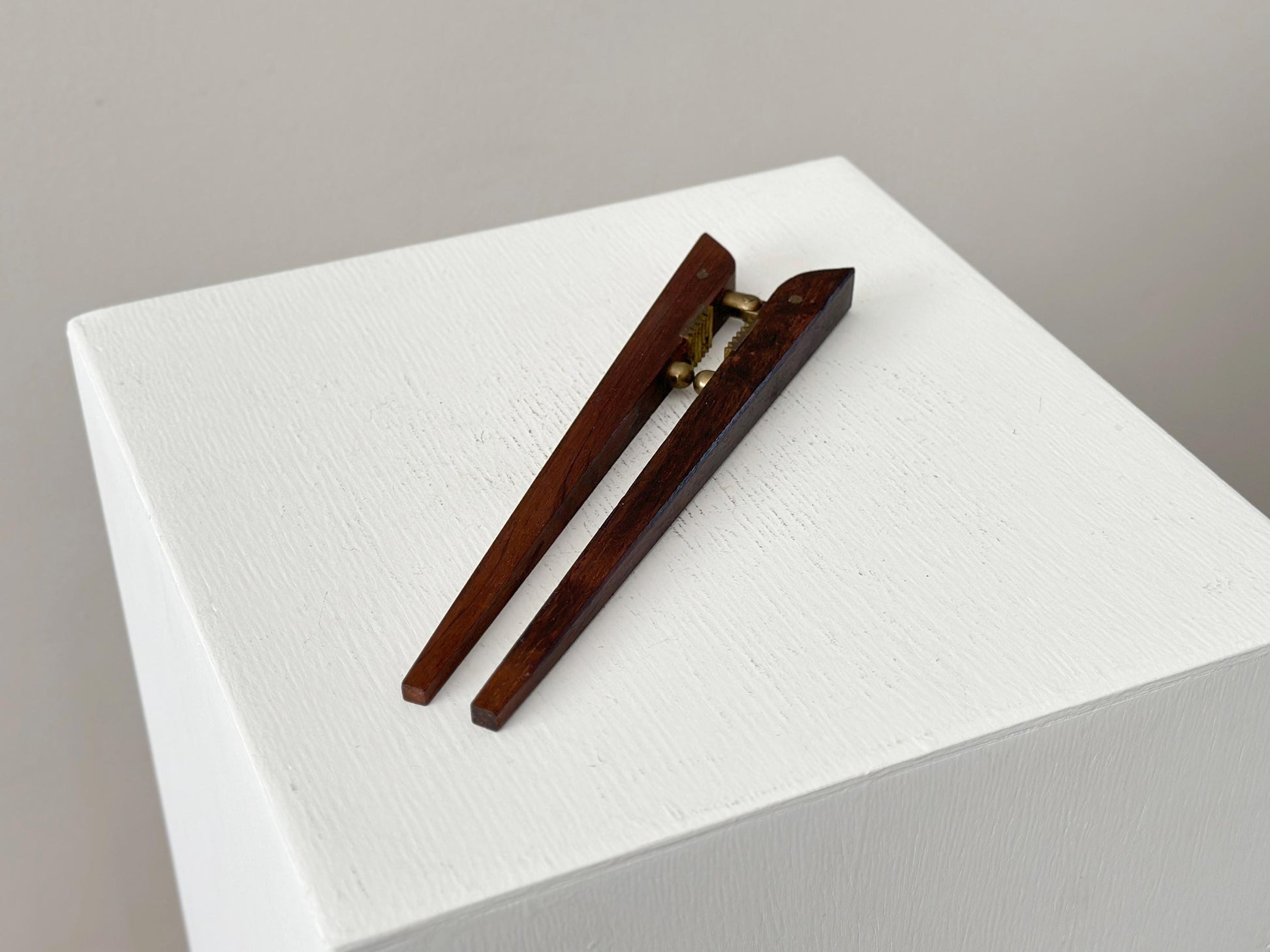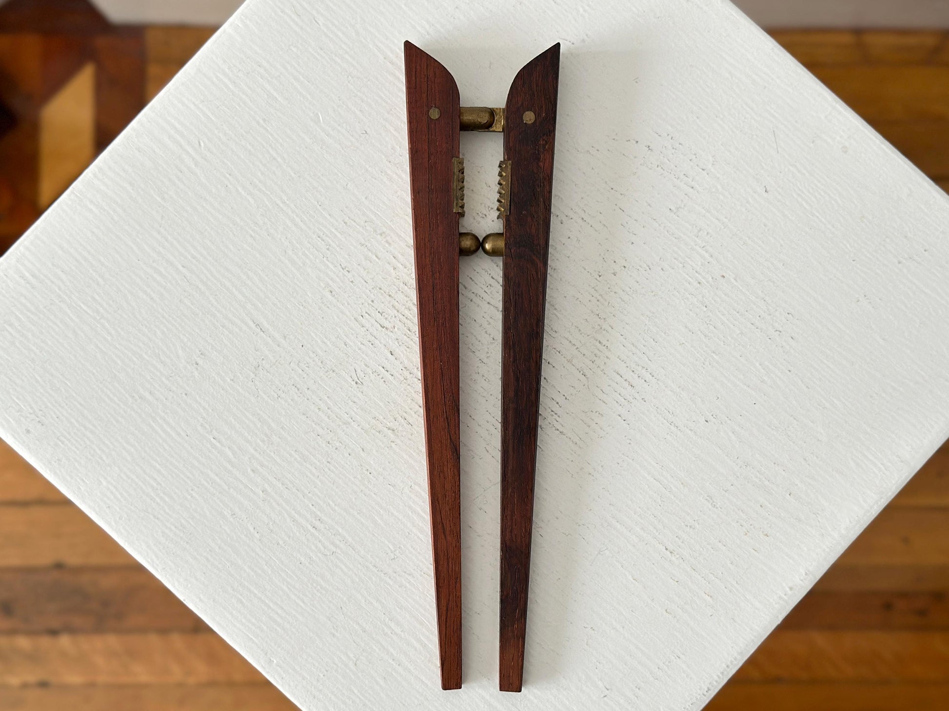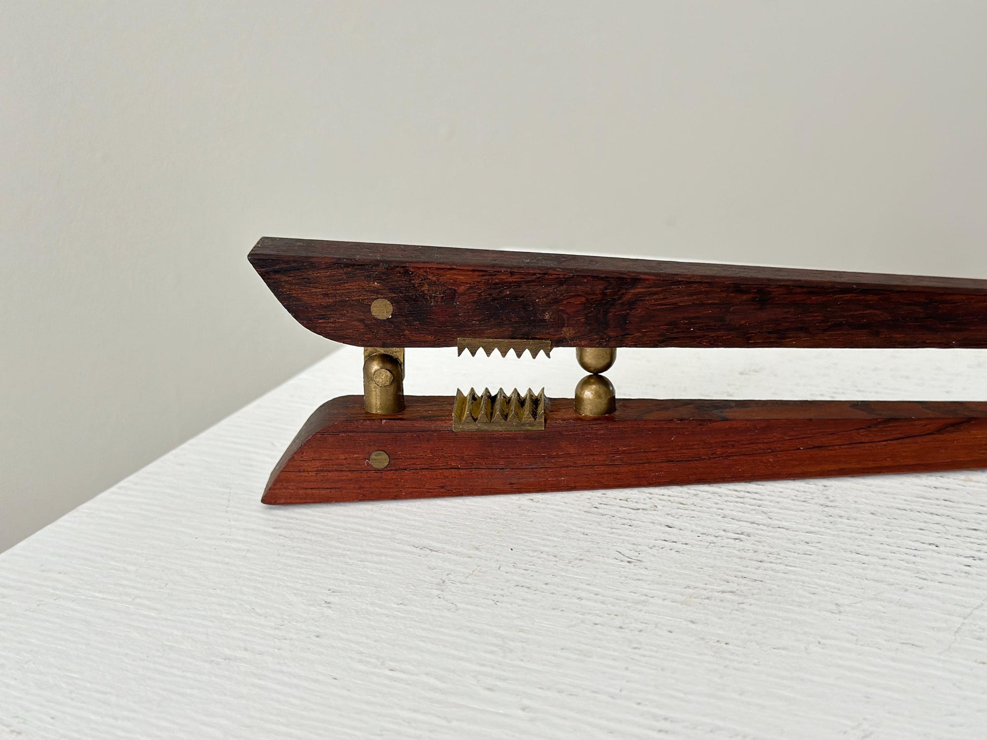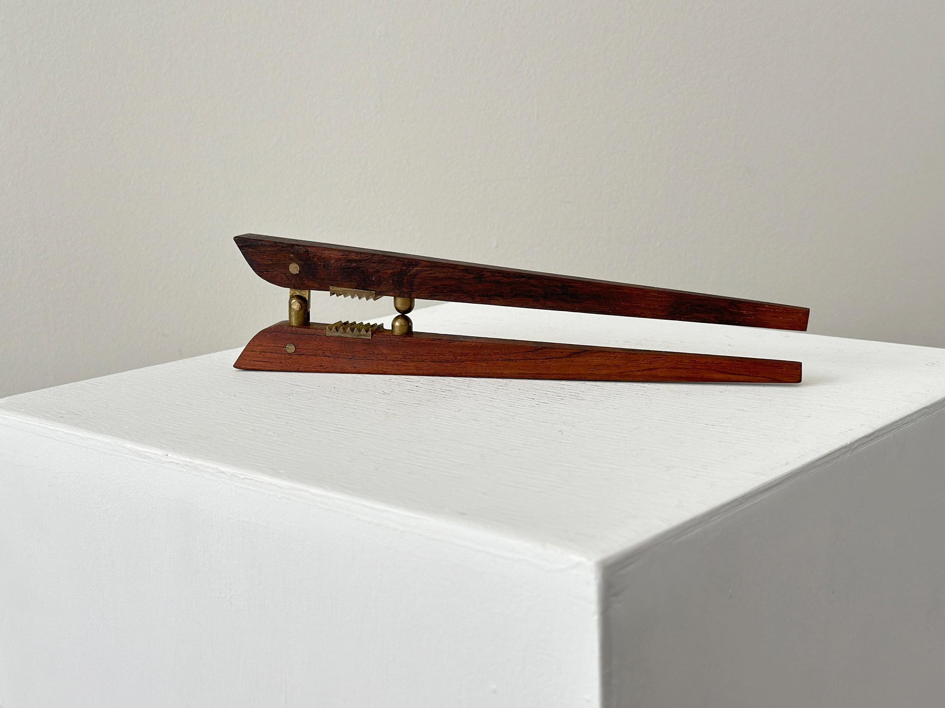 A functional and beautiful vintage nutcracker created by Preben Broste in the 1950s. The rosewood paired with the brass and tapered design make this an wonderful object to display on a table or in a kitchen. This is a pretty large piece at 9.25 inches in length. In great condition and stamped "Made in Denmark".