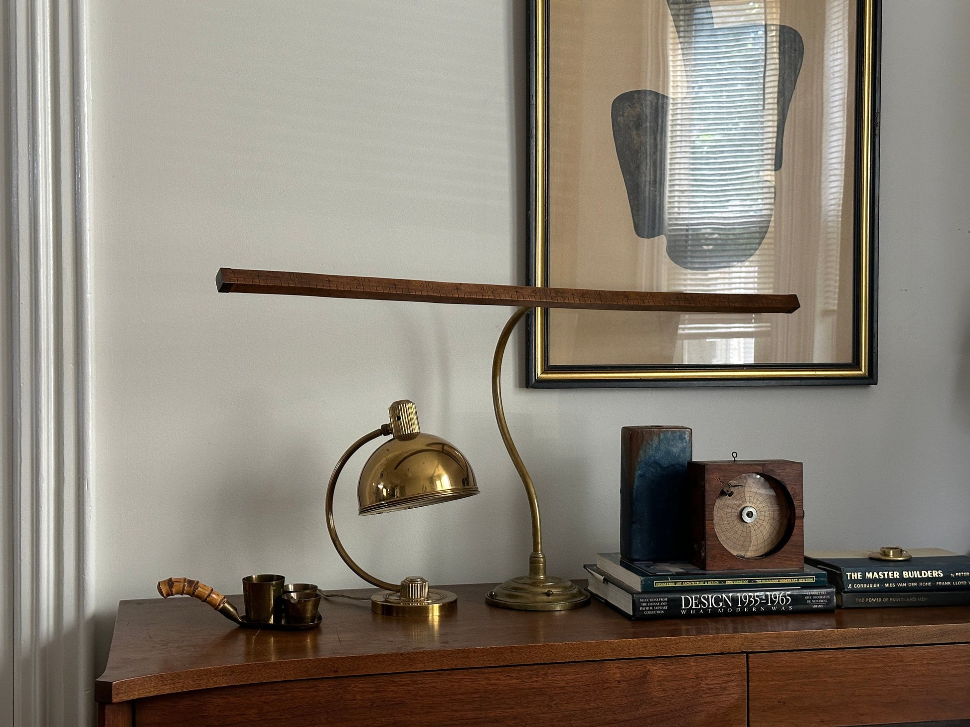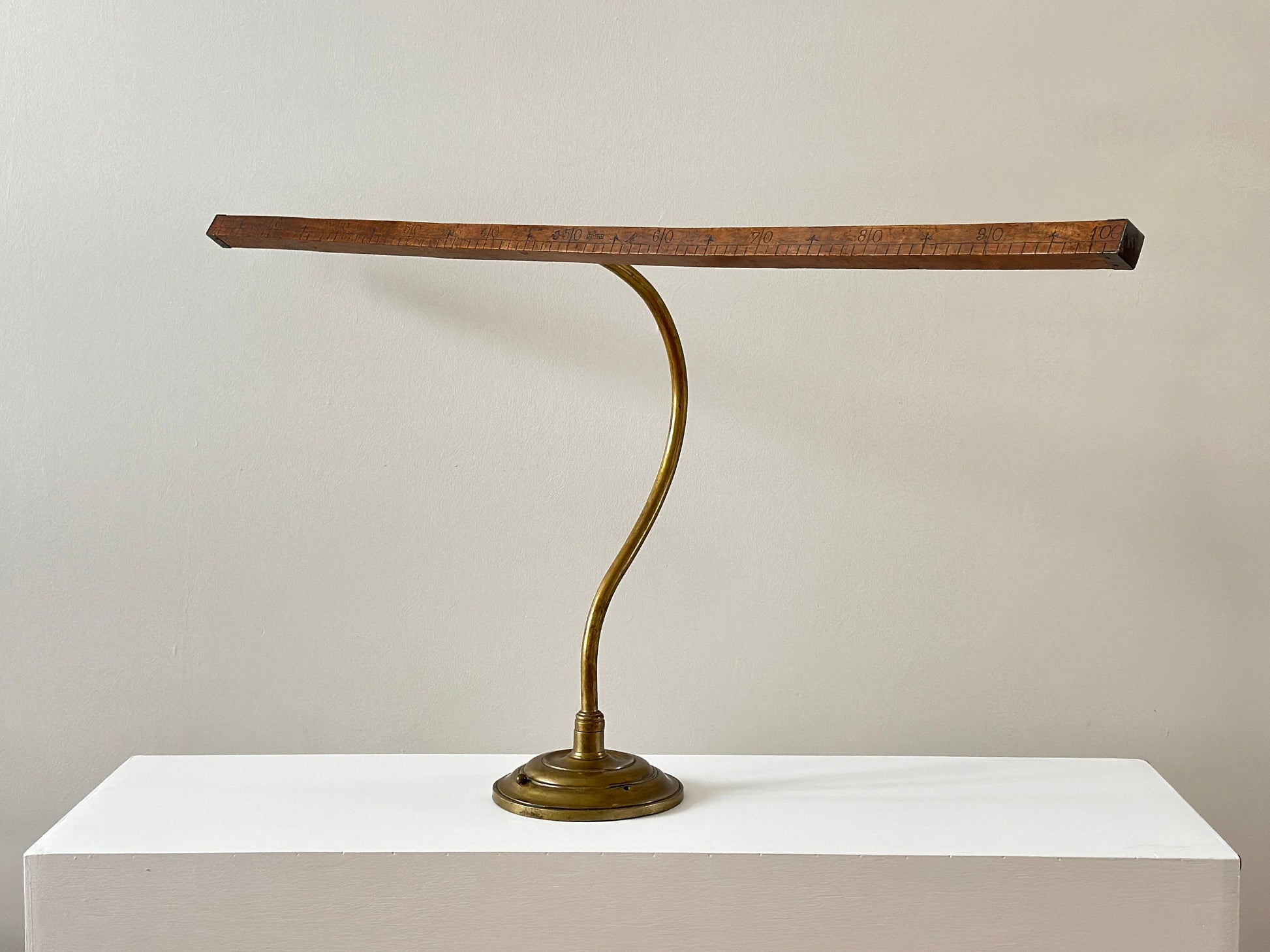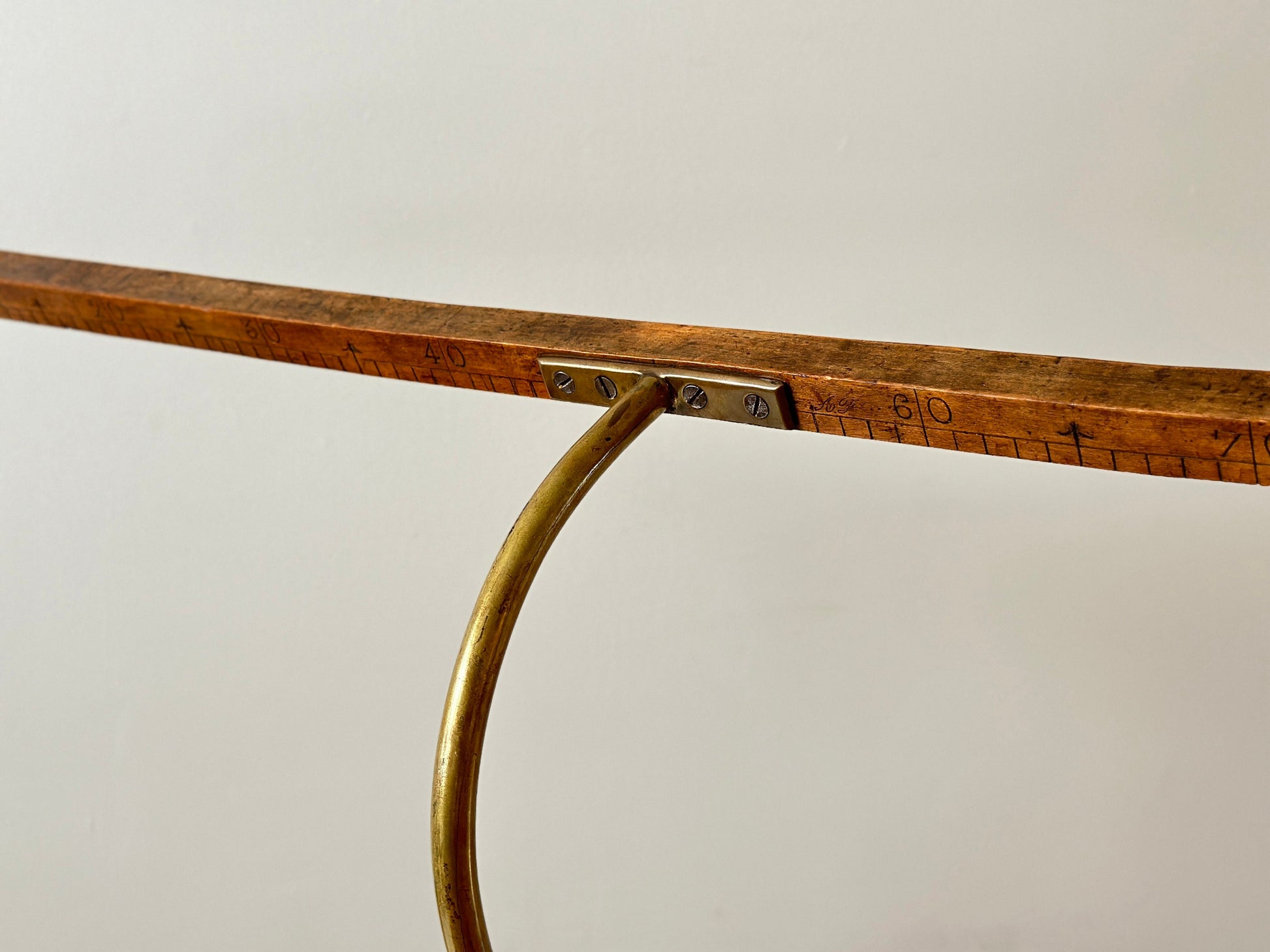Such an eye catching piece! With it's original mount, this antique french tailors measuring stick has a wonderful sculptural quality. The markings are hand made with additional stamps throughout. Near the center on the front and back it is signed "A.F." along with the "Metre". This measuring stick is attached to a brass arm so it could be mounted to a wall. Mounting the measuring stick on a wall would provide stability and convenience, as it would keep the stick at a fixed height and readily accessible.