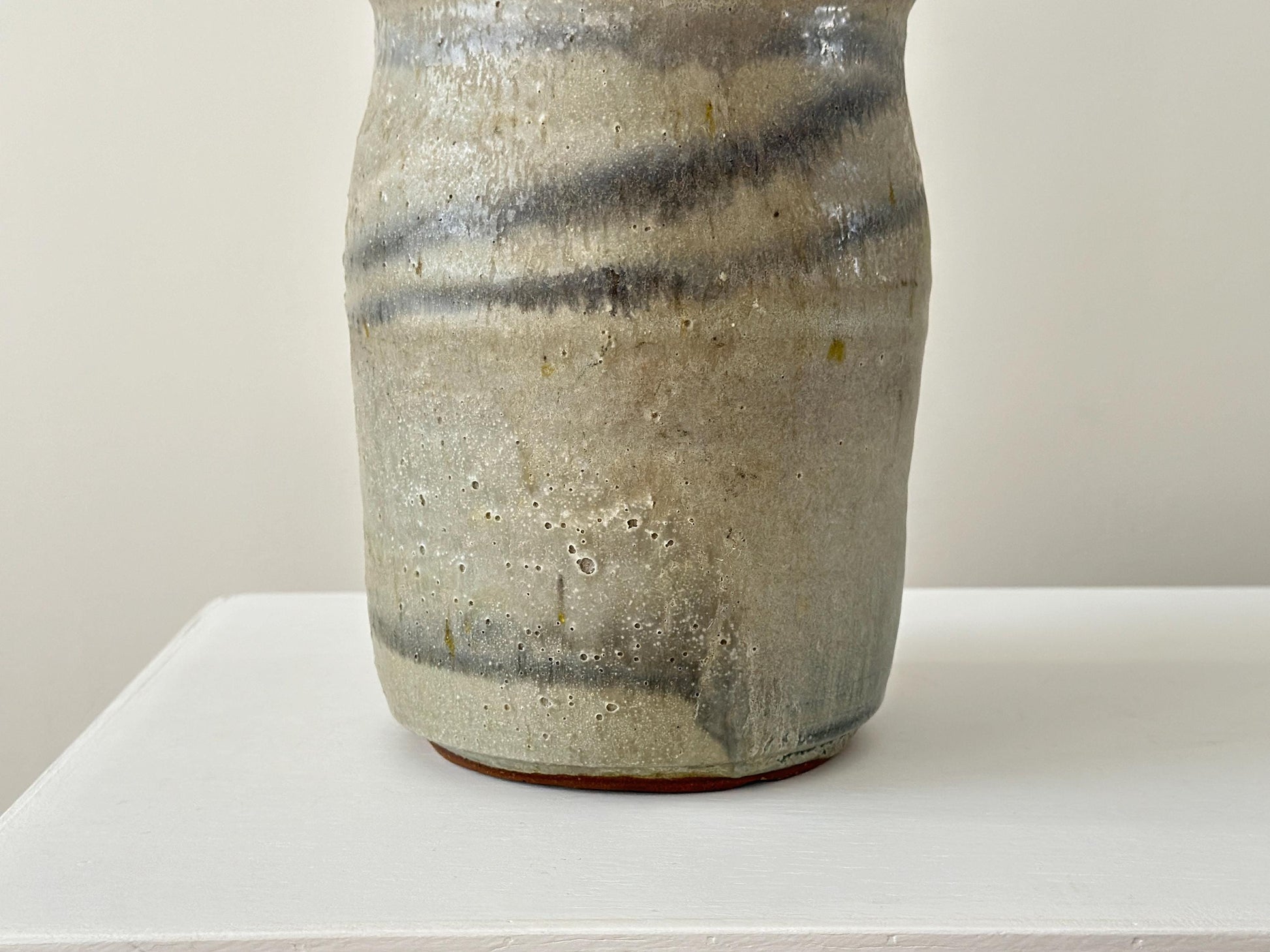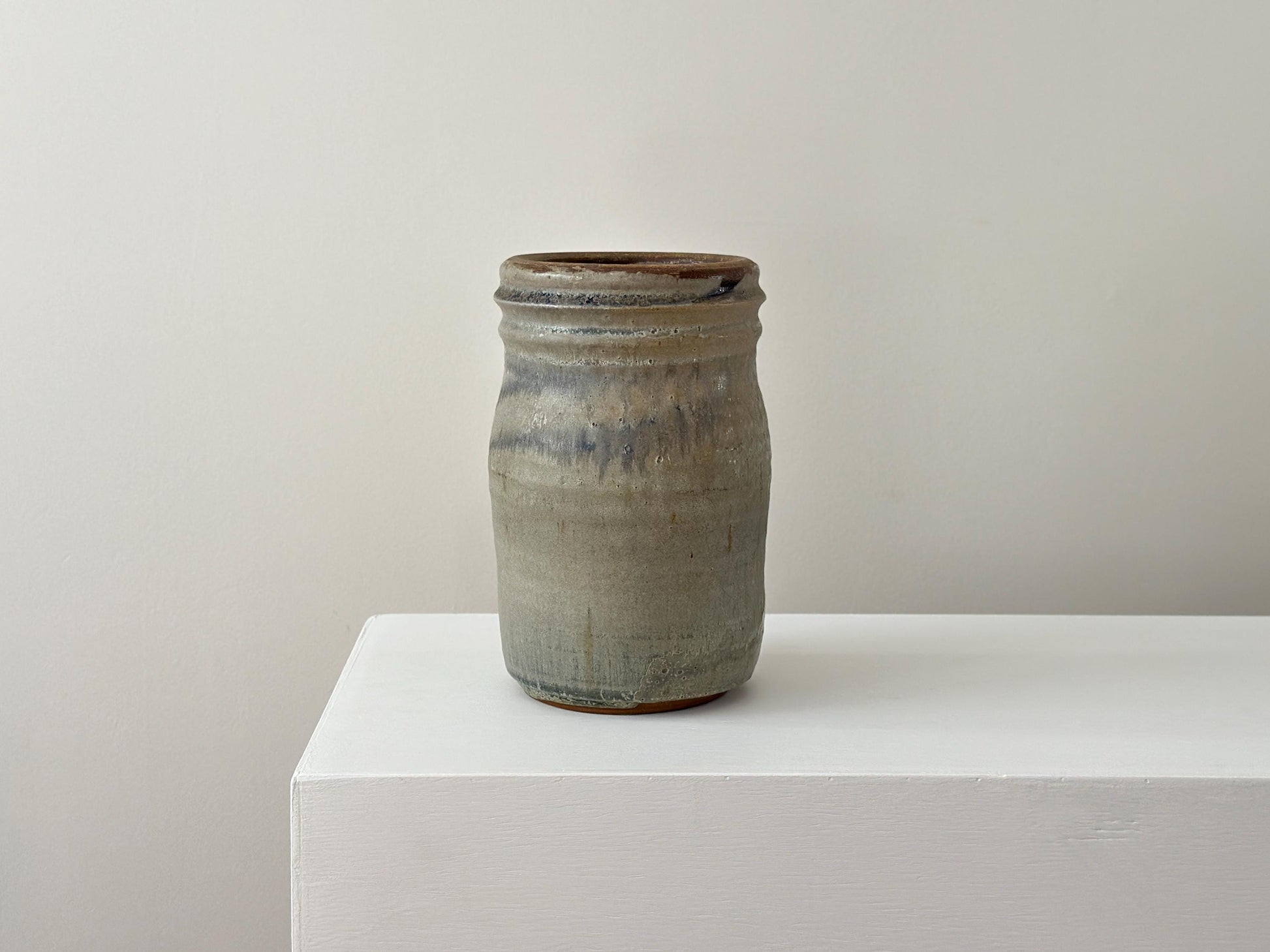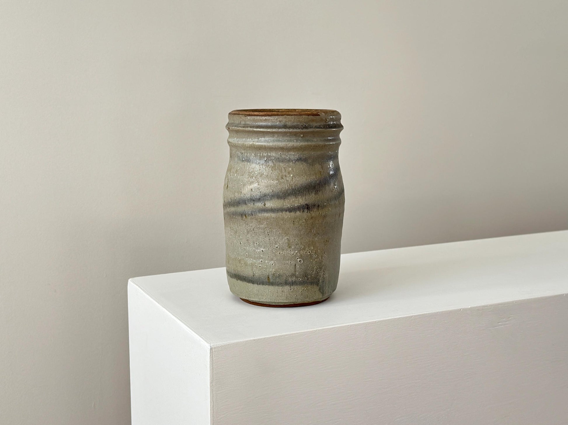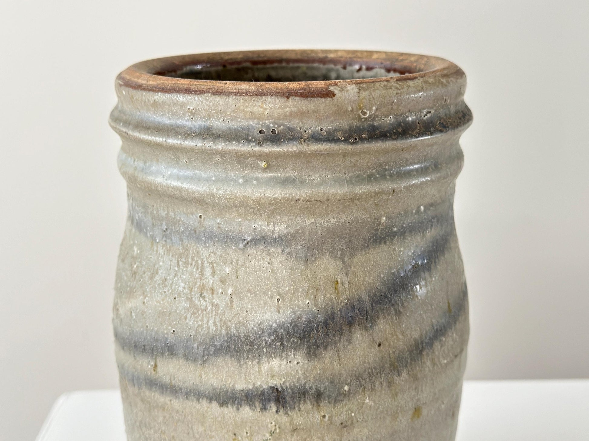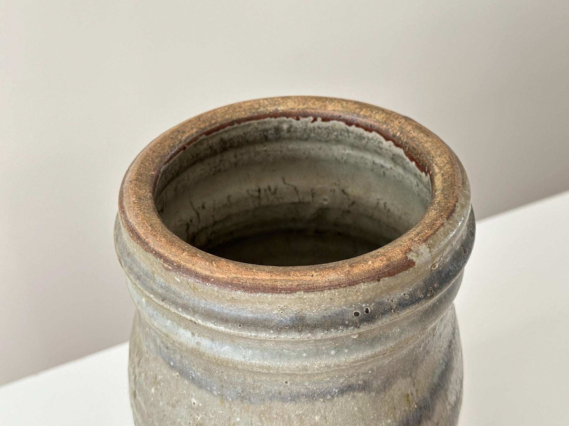 This antique salt glazed stoneware crock features a mesmerizing gray-toned surface with distinctive texture from the salt glazing process. The irregular bands of darker blue-gray and tiny pockmarks create so much visual interest. Its 8.75" height makes it ideal for displaying kitchen utensils or dried flowers, adding both function and rustic charm to any kitchen or dining space.