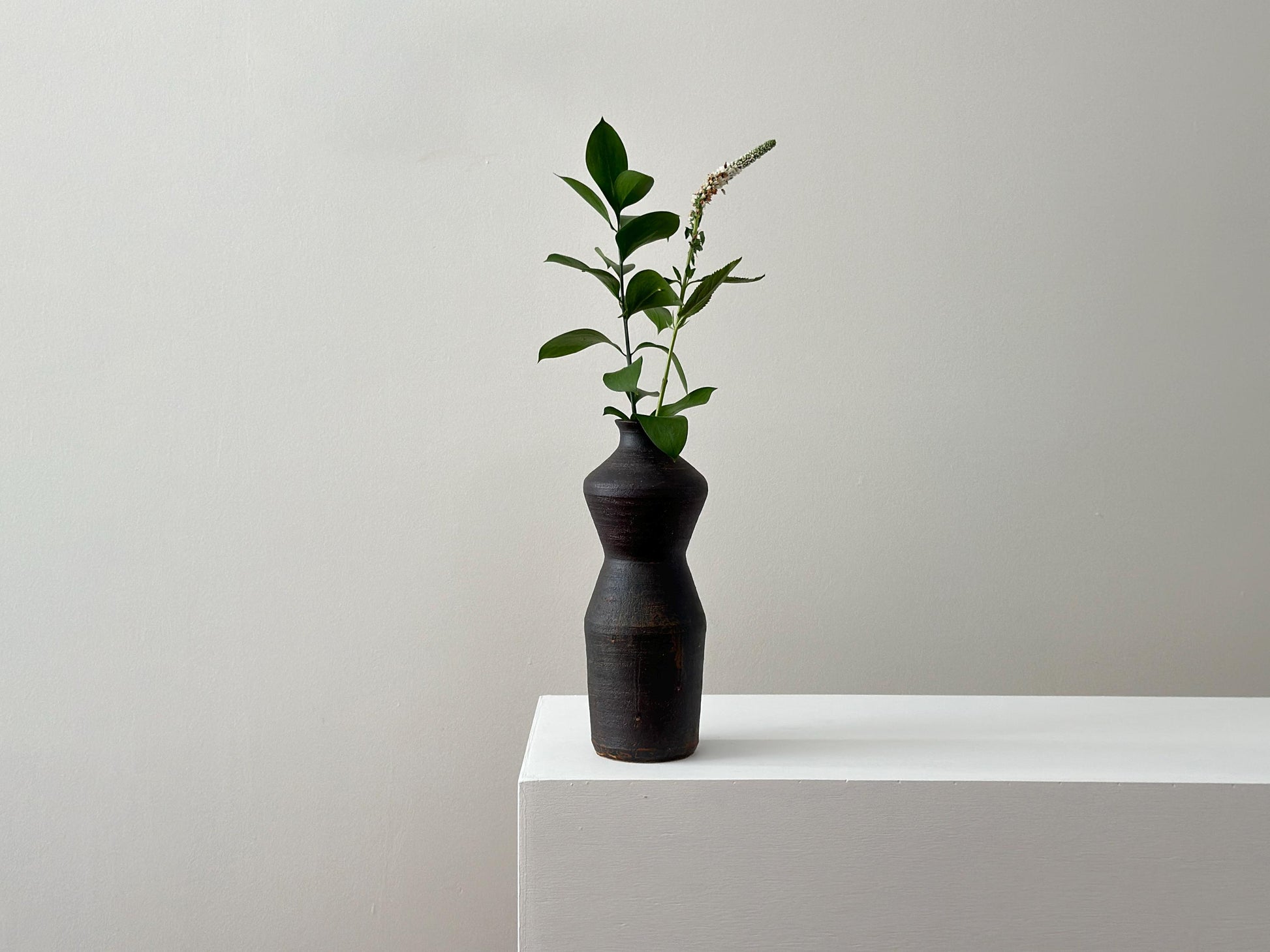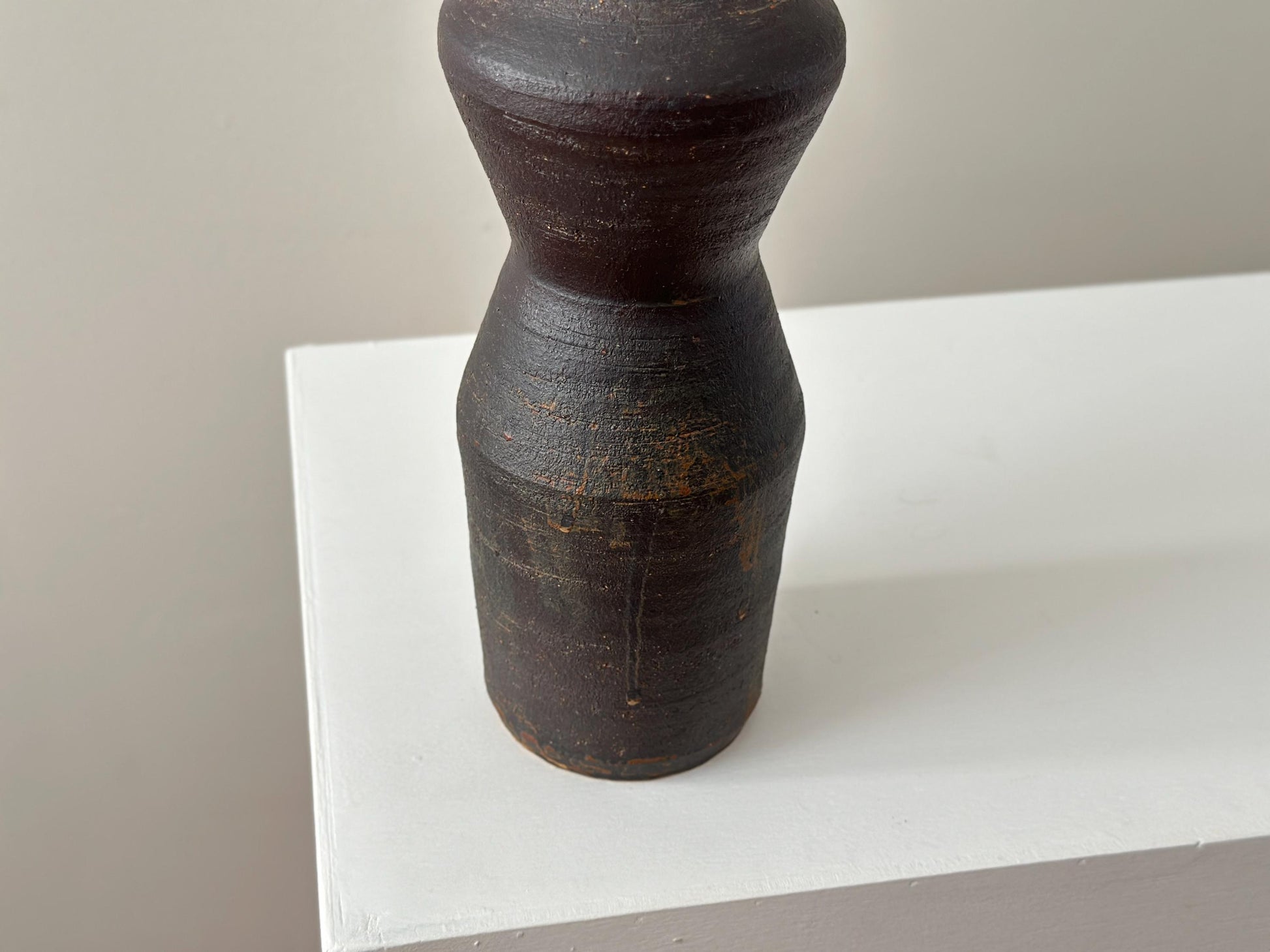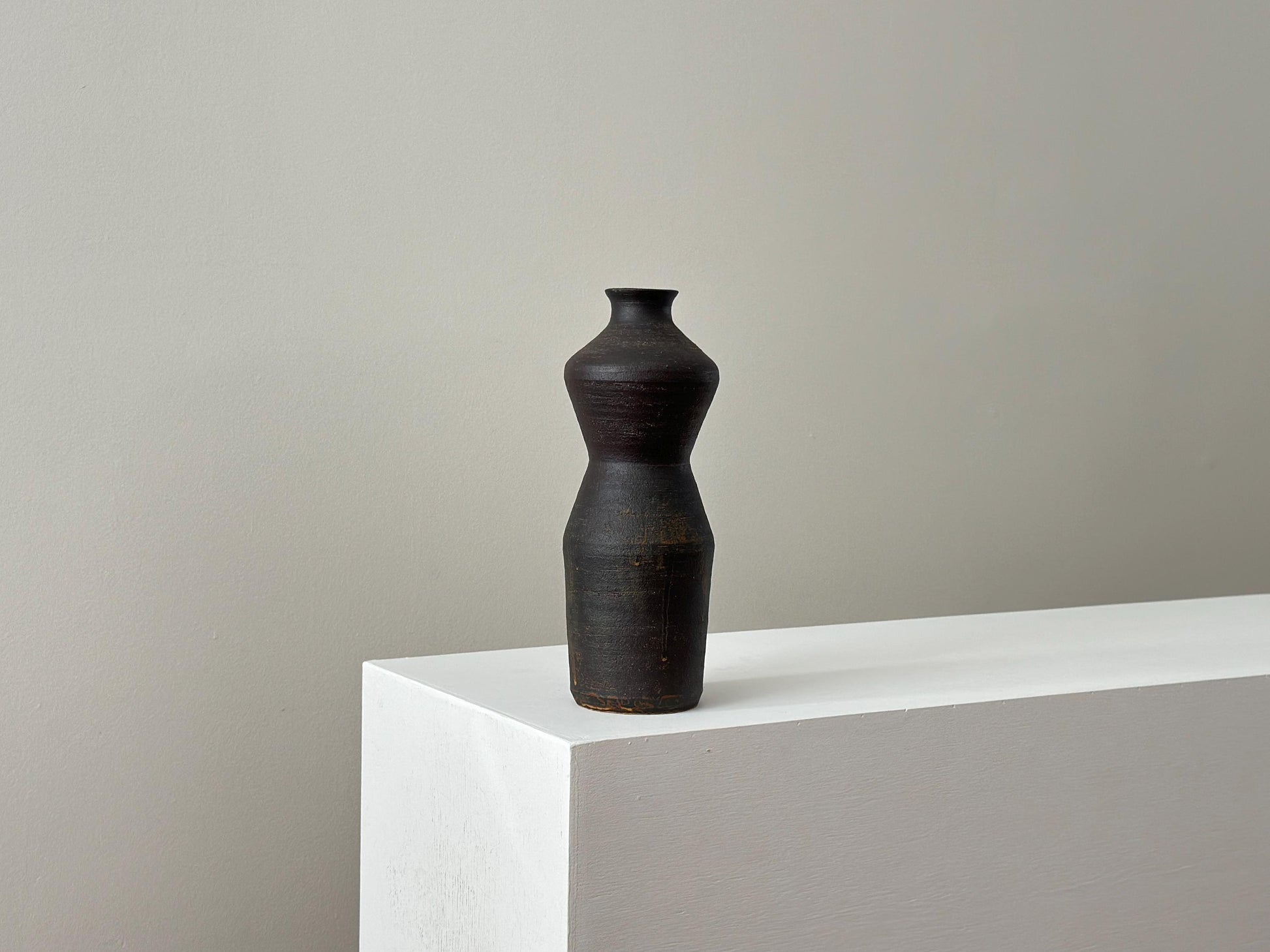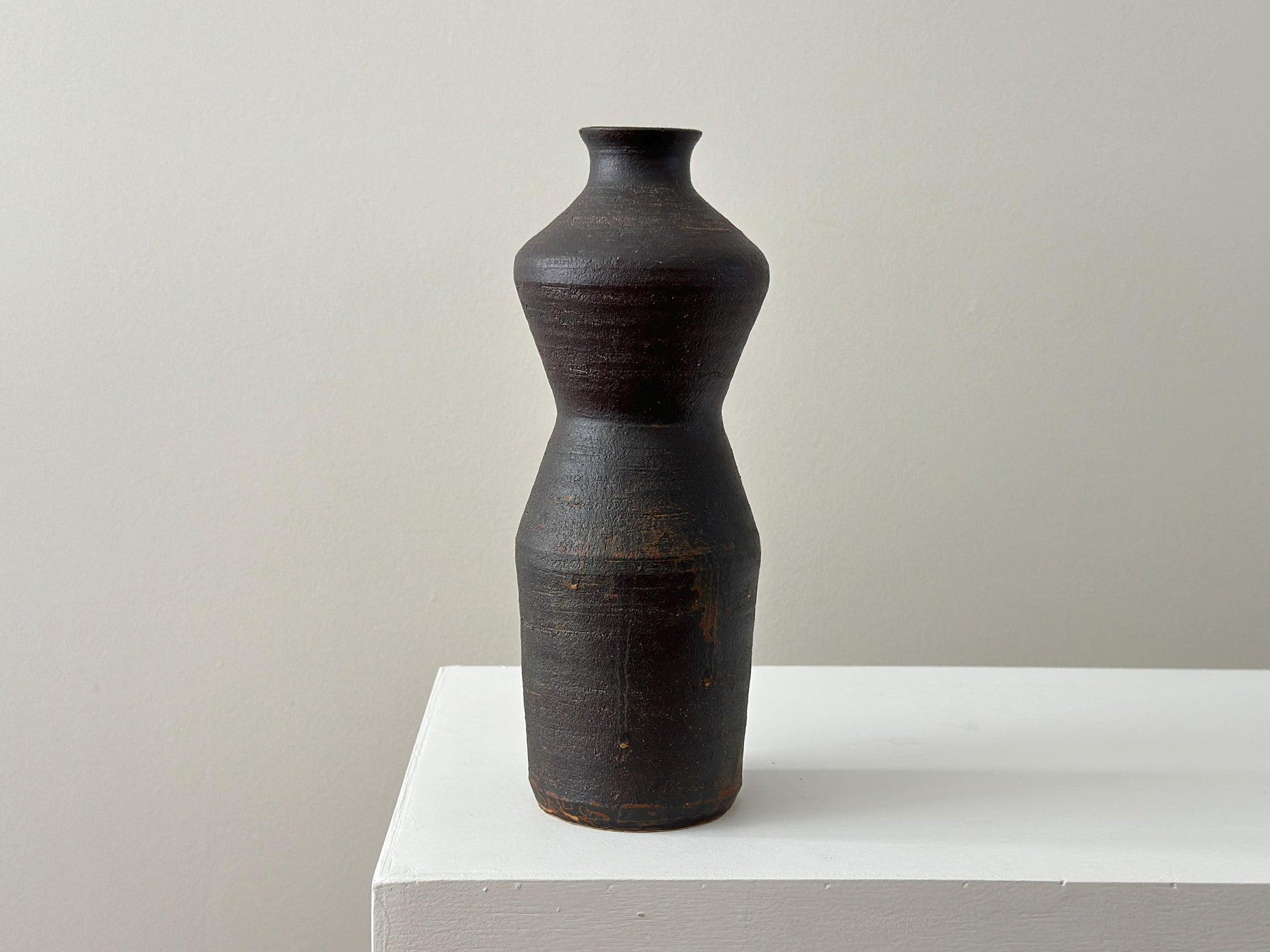 This vintage stoneware vase has a great and distinctive hourglass silhouette, reminiscent of a stylized female form. Its dark, matte surface has a really wonderful texture. This sculptural shape, combined with its earthy, monochromatic palette, gives the vase a strong presence that balances elegance with a raw, organic aesthetic.